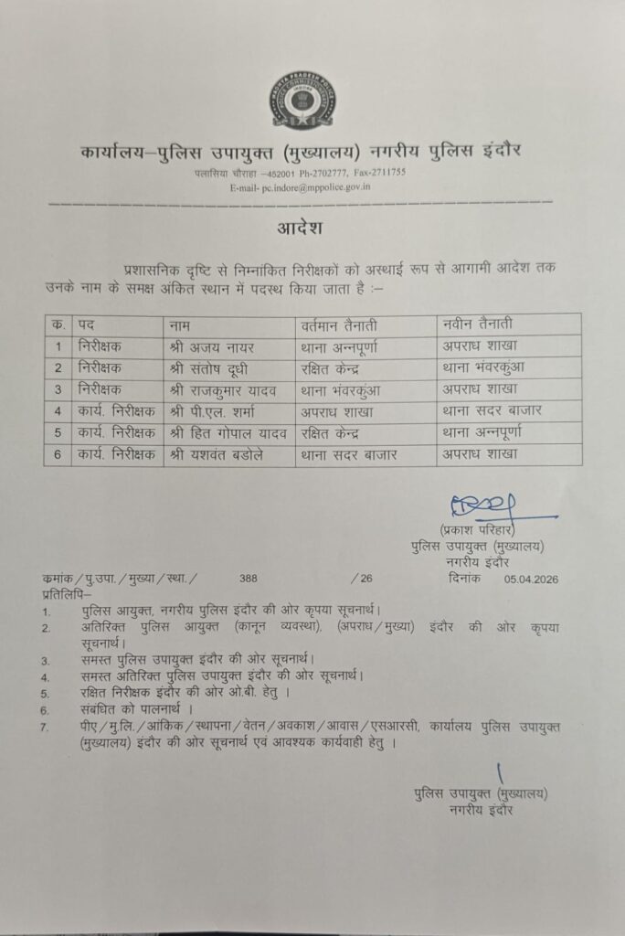 वही हित गोपाल यादव को अन्नपूर्णा थाना का नया प्रभारी बनाया गया है। पहले उन्हें भंवर कुवा थाने की जिम्मेदारी दी गई थी। पीएल शर्मा को सदर बाजार थाने की कमान दी गई है। यह इंदौर की सबसे व्यस्त और महत्वपूर्ण इलाका है।