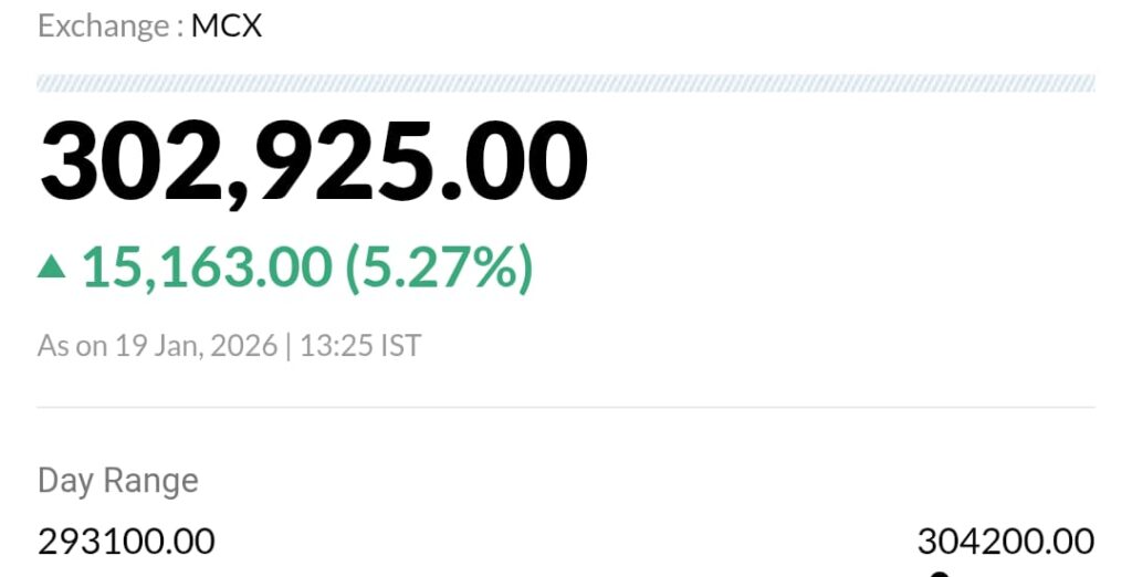 Silver Price: चांदी की कीमतों ने आज बाजार खुलते ही इतिहास रच दिया है। एमसीएक्स की रिपोर्ट के अनुसार चांदी के दाम आज बंपर उछाल के साथ तीन लाख प्रति किलो से ऊपर पहुंच गए हैं। चांदी की कीमतों में पिछले 1 महीने में 1 लाख रुपए प्रति किलो से अधिक की बढ़त दर्ज की गई है। एमसीएक्स की रिपोर्ट के अनुसार आज 19 जनवरी, सोमवार की सुबह चांदी की कीमतों में 15 हजार रुपए प्रति किलो से अधिक की बढ़त देखने को मिली है। चांदी की कीमतें बीते शुक्रवार को तकरीबन 2.87 लाख प्रति किलो थी, जो आज 15 हजार रुपए प्रति किलो से अधिक की बढ़त (silver rate hike) के साथ 3 लाख से ऊपर पहुंच गई है। ताजा जानकारी के अनुसार चांदी की कीमत आज बंपर उछाल के साथ 304200 प्रति किलो (today silver rate) पर पहुंच गई है।